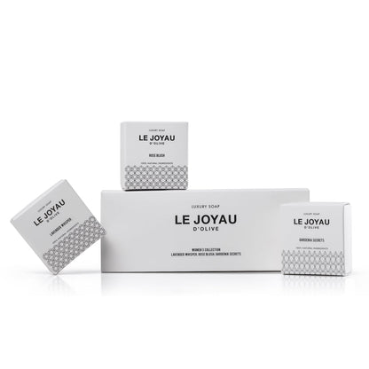The luxury and sensual pleasure of Le Joyau d'Olive soaps are the result of craftsmanship that is centuries old. Each of our soap bars are infused with the subtle fragrance of essential oils and waters from flowers that grow in sun-kissed Mediterranean soils and blossom in the clear mountain air of the Levant. Hand-picked and perfectly distilled to be kind to nature, and even kinder to your body. This gift set collection contains 3 bar soaps:LAVENDER WHISPER: The perfume of the pharaohs. Plucked from fragrant meadows, the delicate petals of lavender yield an essential oil to delight the senses and relax the mind. ROSE BLUSH: A scent to soothe the mind and enhance the mood, from the petals of newly opened flowers picked at sunrise in early summer. And in every bar, a garden of roses. GARDENIA SECRETS: Seductively alluring, yet fresh and feminine, the essential oil of the delicate Gardenia flower is the secret of the world’s most expensive perfumes. It can be your secret, too.