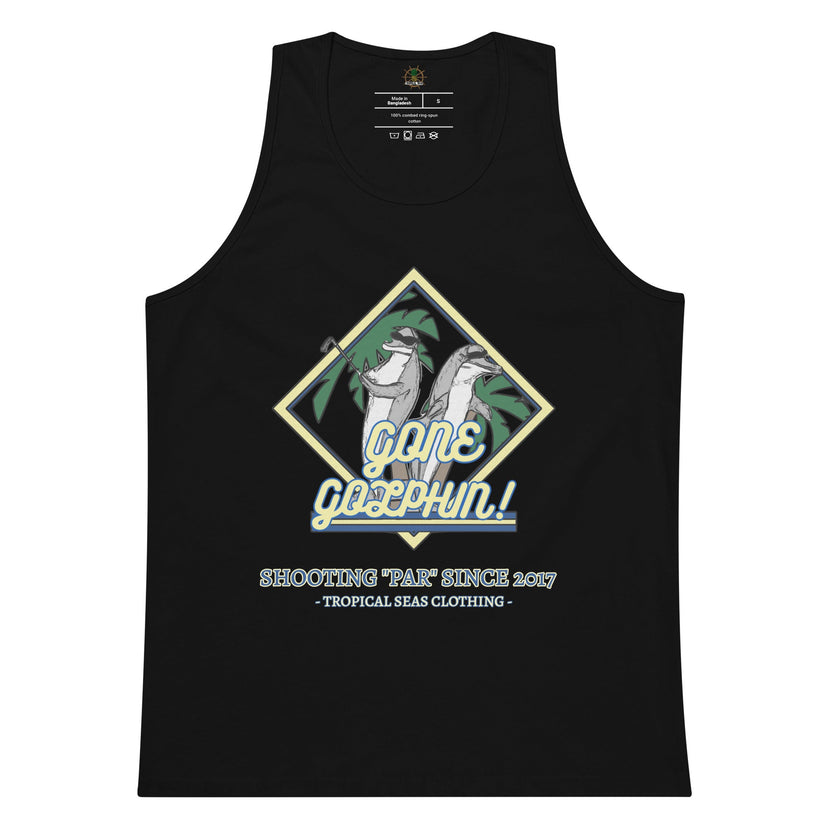 This Men’s Premium Gone Golphin Tank Top is perfect for golf enthusiasts and Ocean Lovers. Show off your playful style with the whimsical dolphins featured on the design. Crafted from breathable fabric, it’s perfect for warm days on the greens.