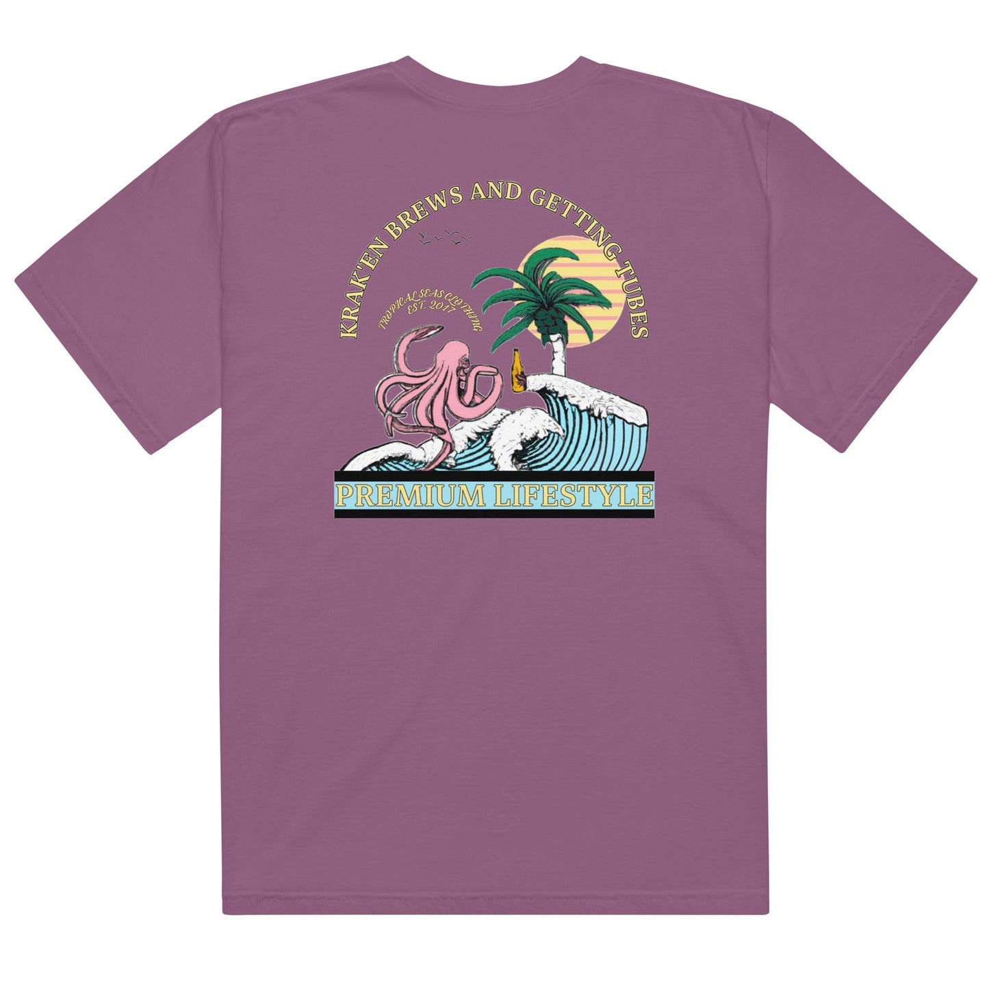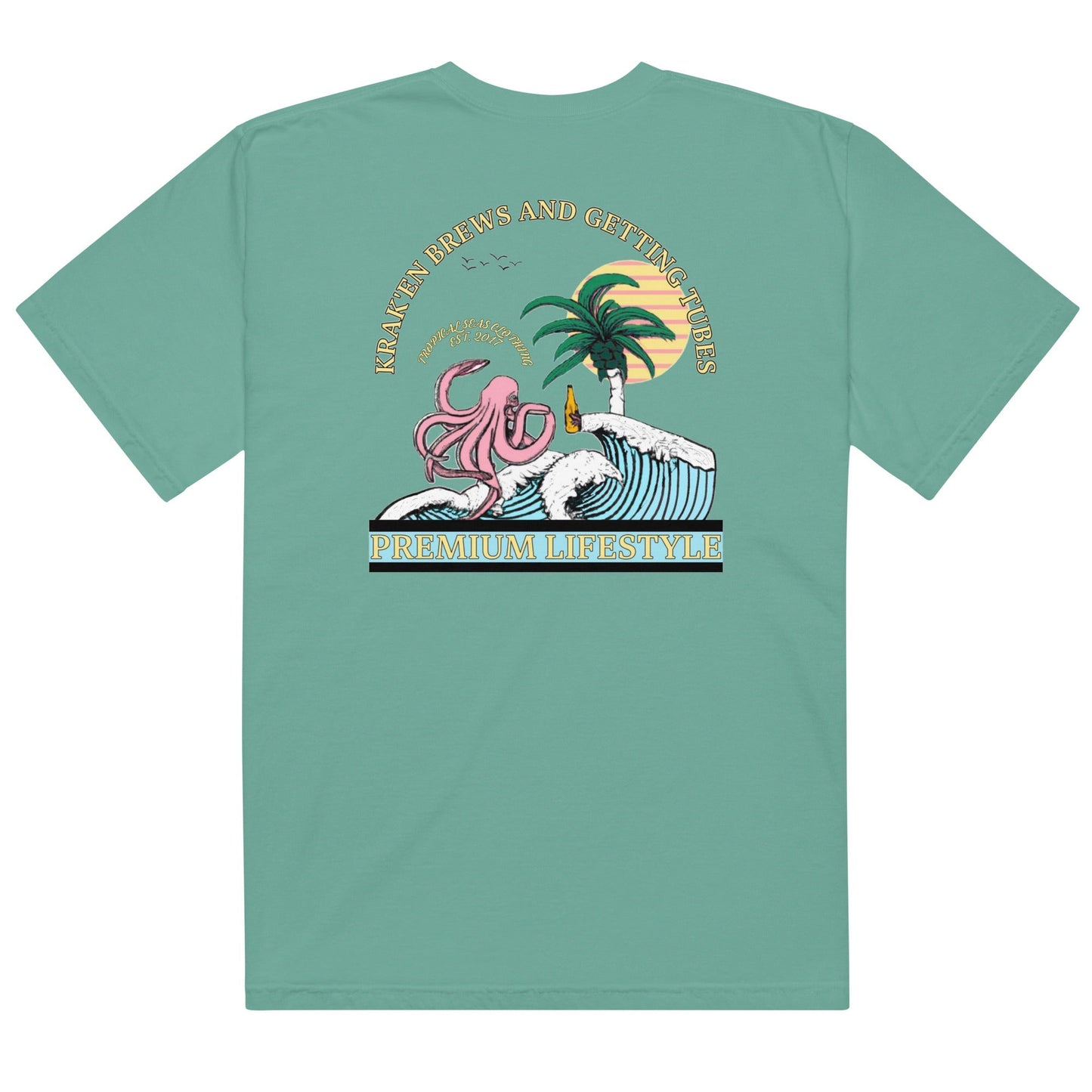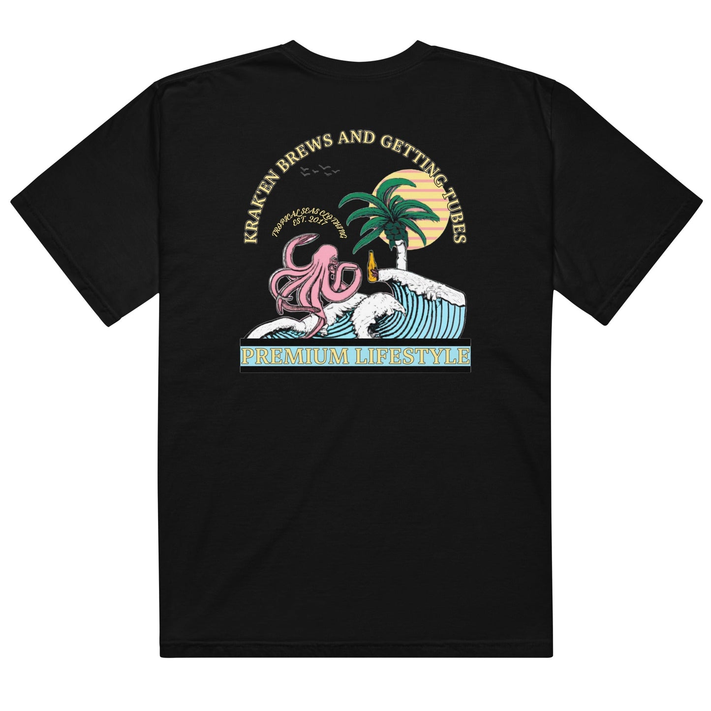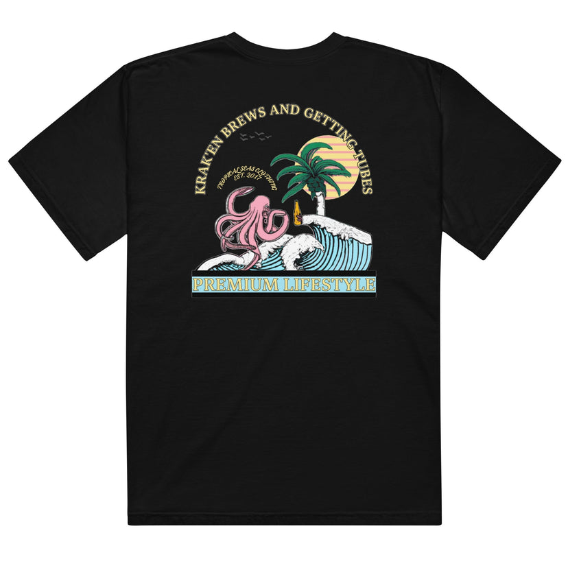 Introducing Tropical Seas Clothing's Men's Premium Lifestyle heavyweight t-shirt, featuring a bold image of a Kraken enjoying a beer with some gnarly ocean tubes. Made with high-quality materials, this t-shirt is perfect for the beach or the boardwalk. With its comfortable fit and unique design, it's sure to turn heads. Made for ocean lovers, this t-shirt is a must-have addition to any wardrobe. Get yours today and show off your love for the sea!