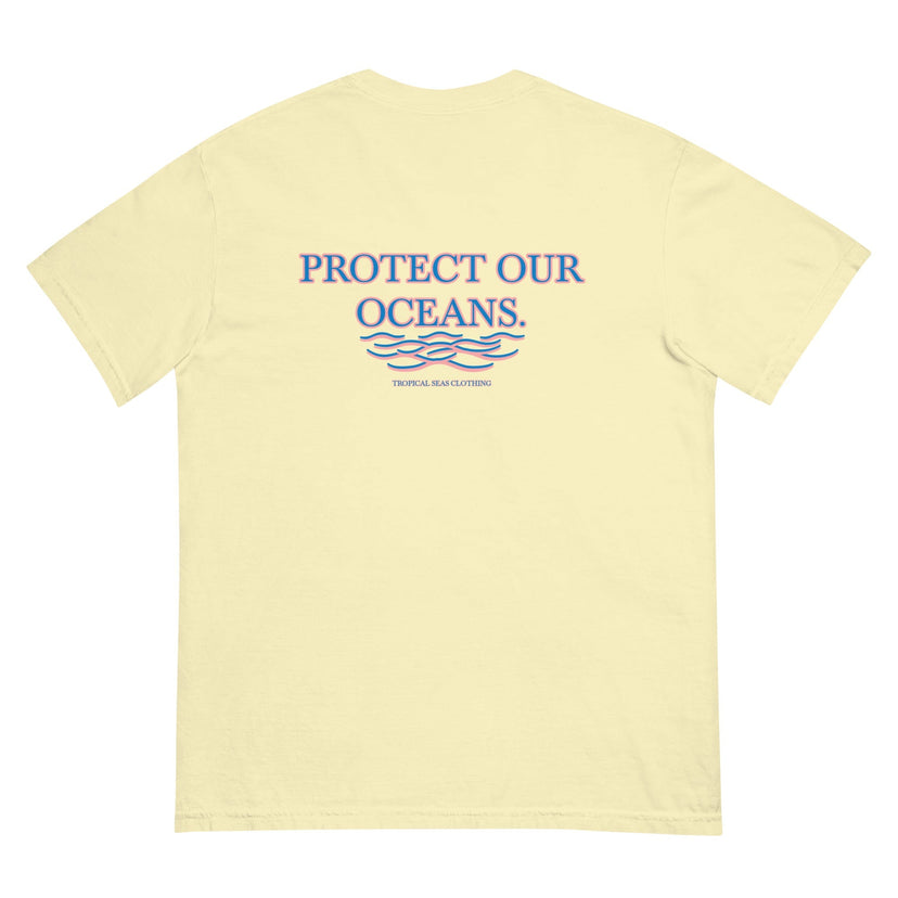 Elevate your summer style with the men's Protect Our Oceans tropical t-shirt. This premium tee features a classic, sophisticated fit made with durable ring-spun cotton material that is both soft and comfortable. The tropical print design adds a touch of island vibes to your wardrobe. Whether layered or worn on its own, the men's Hawaiian shirt is the perfect choice for effortless summer style. Upgrade your wardrobe today with this must-have men's tropical print t-shirt!