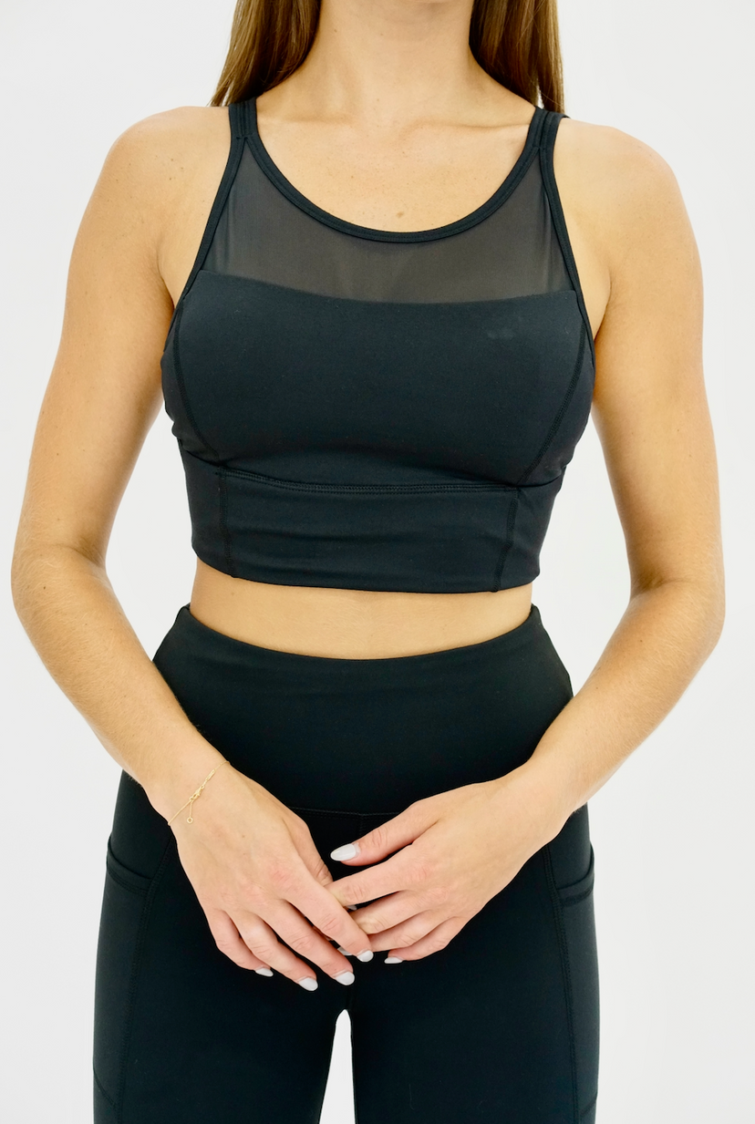Featuring a unique criss cross back, mesh detailing, and pockets for optional, removable cups. This bra-top also has a built-in shelf bra for added support and coverage!