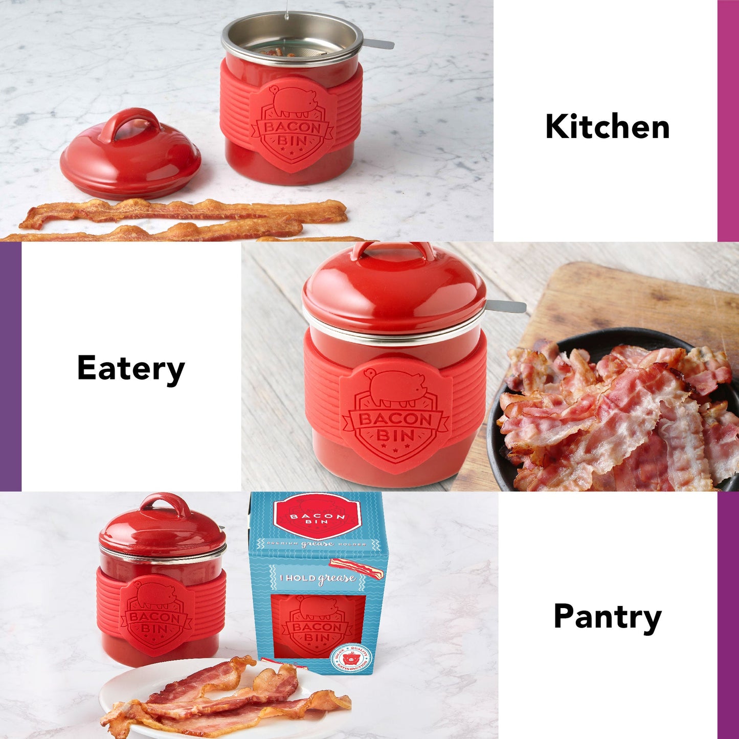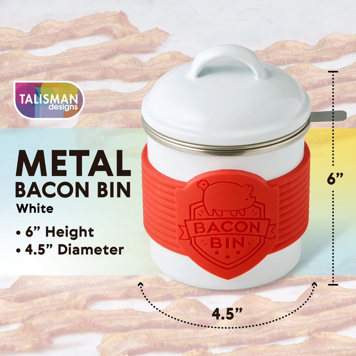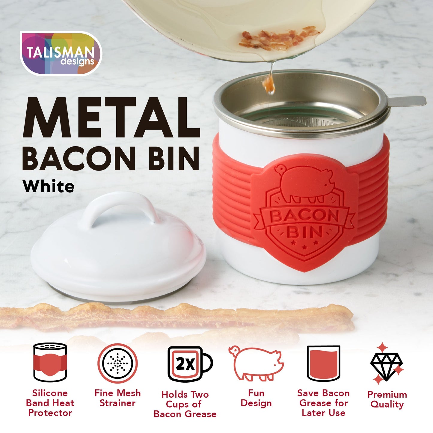 The Metal Bacon Bin has a stylish design to match any kitchen look and the silicone band provides safe handling. Metal Bacon Bin holds two cups of bacon grease.