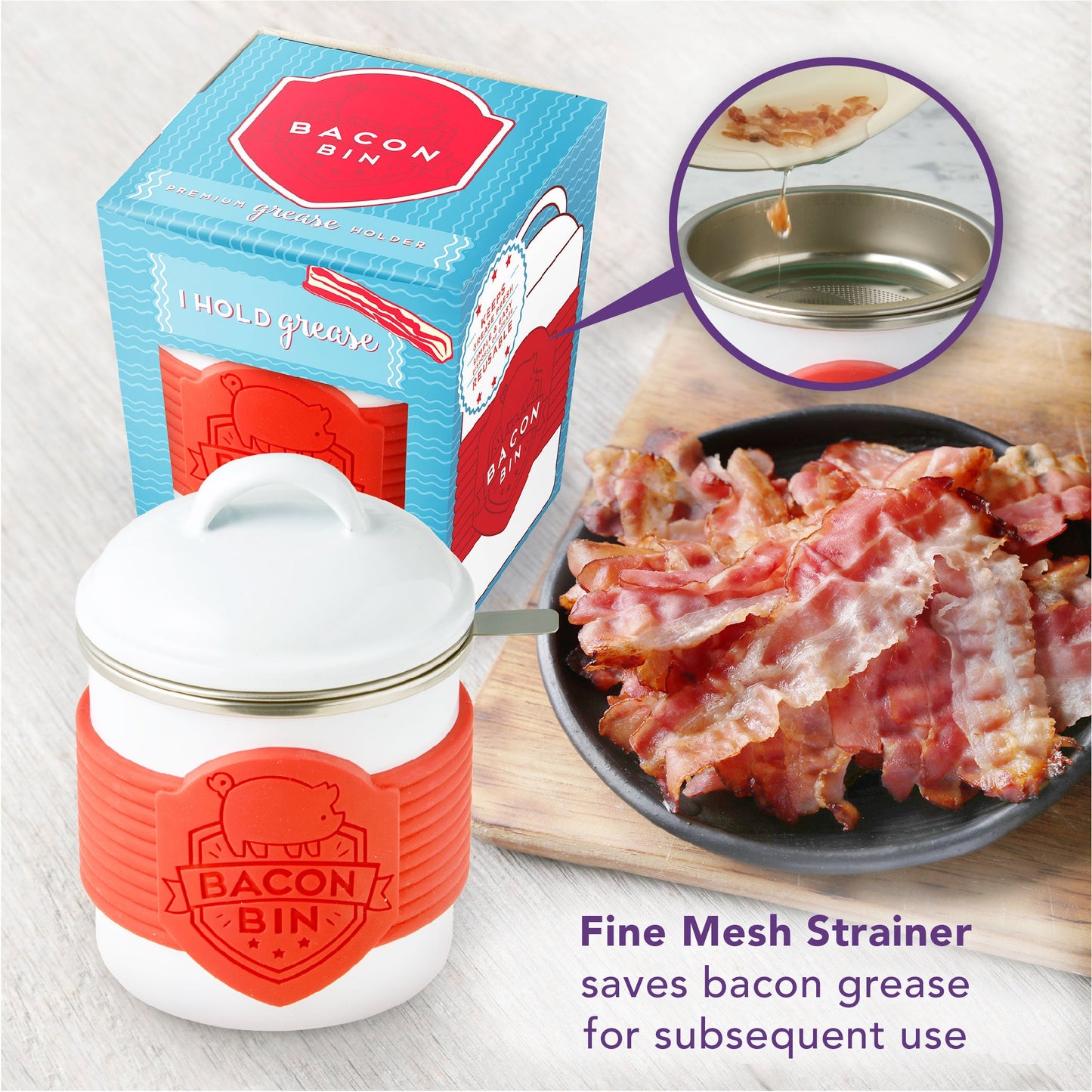 Every Bacon Bin will save your household pipes and sewer! Pour bacon fat down the Bacon Bin, not down the sink. The removable strainer keeps bacon bits out of the grease in case you want to reuse the grease for cooking. When you are ready to discard the grease, simply fill up the Bacon Bin, place it in the fridge to congeal the grease, and then scoop out the cooled grease into the garbage.