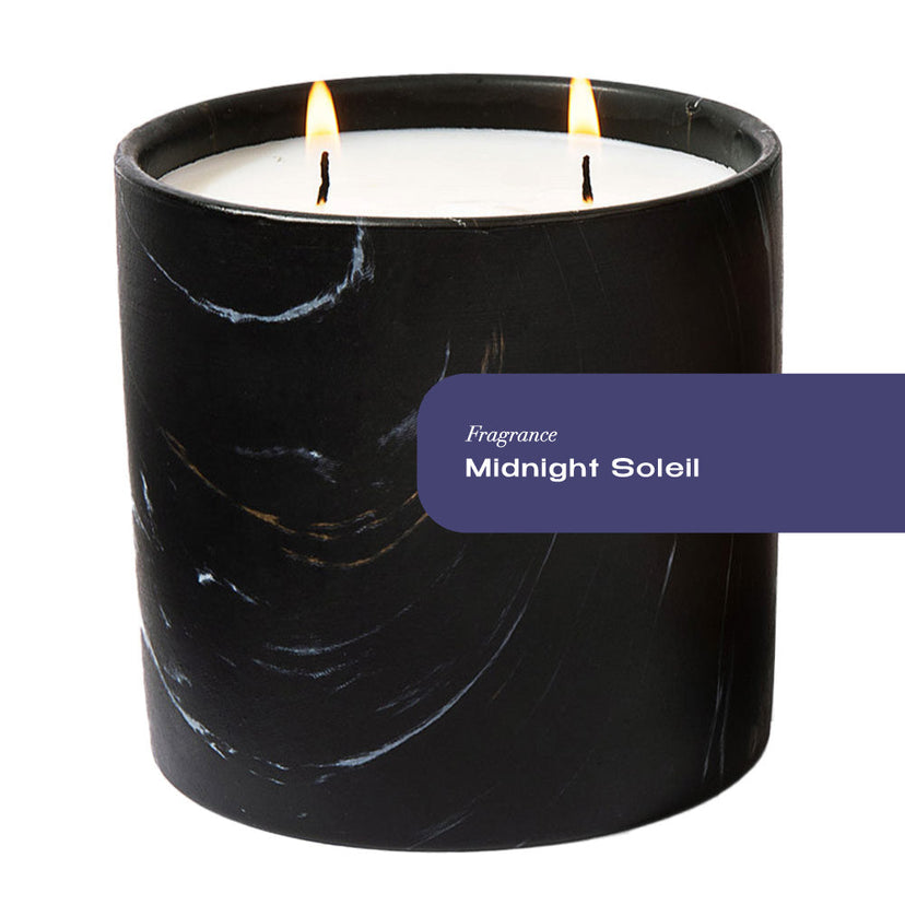 A handmade, hand-painted ceramic vessel featuring a unique marquina design: black with elegant swirls of white and gold. This timeless décor will live on long after the candle has finished burning either refilled as another Plant Based Candle, as a planter for your favorite flora, or a practical container for your precious goods.