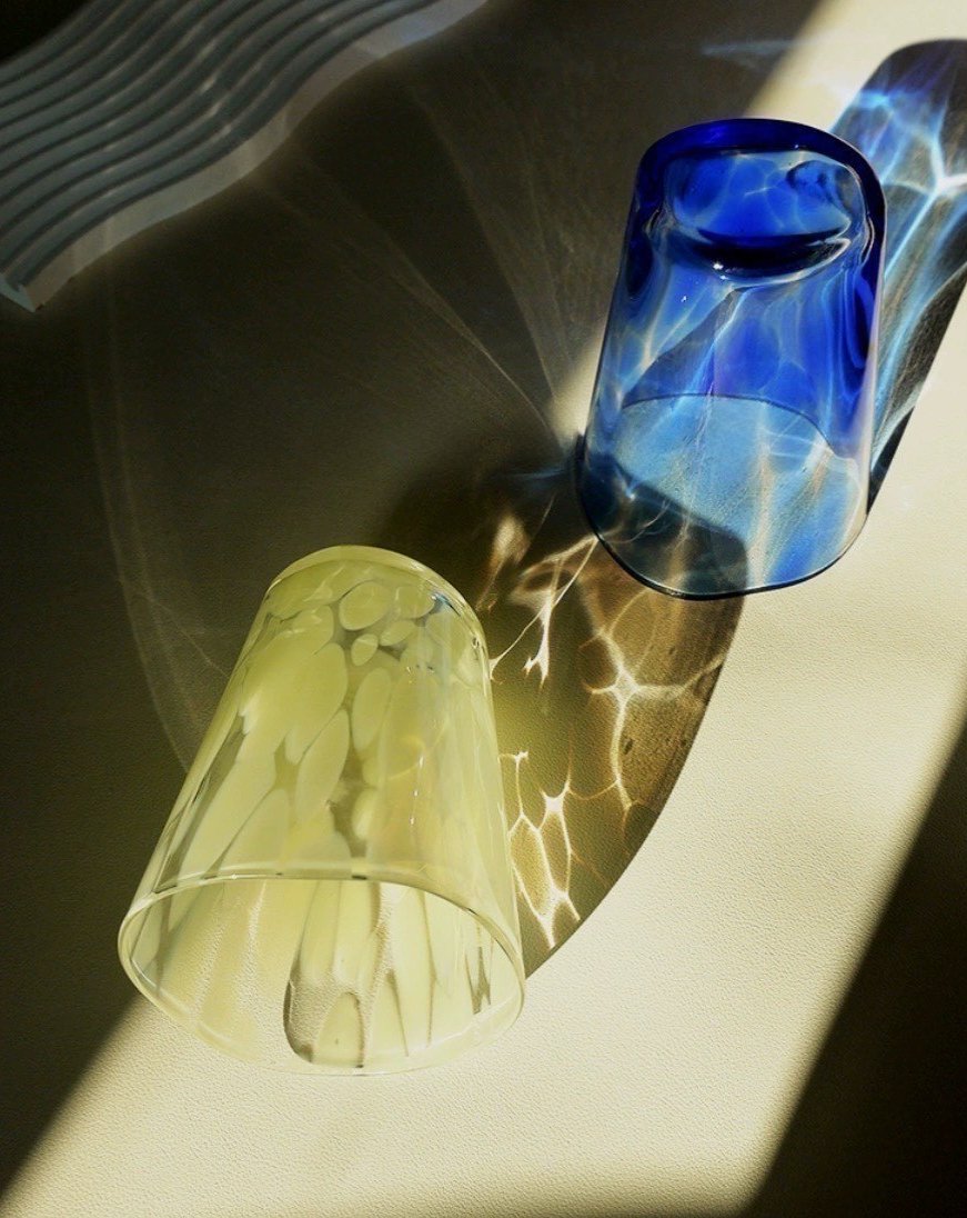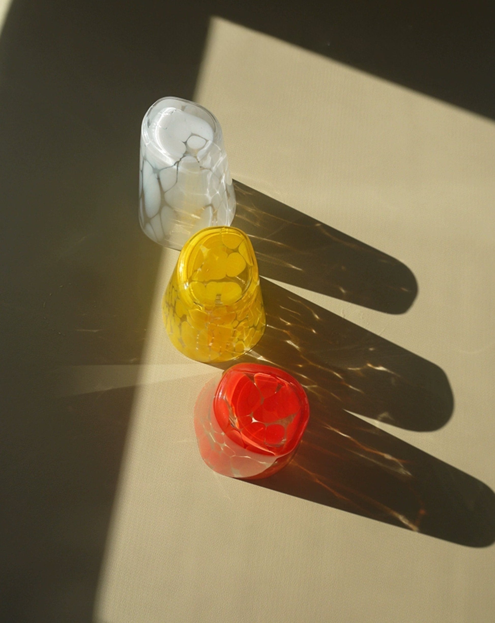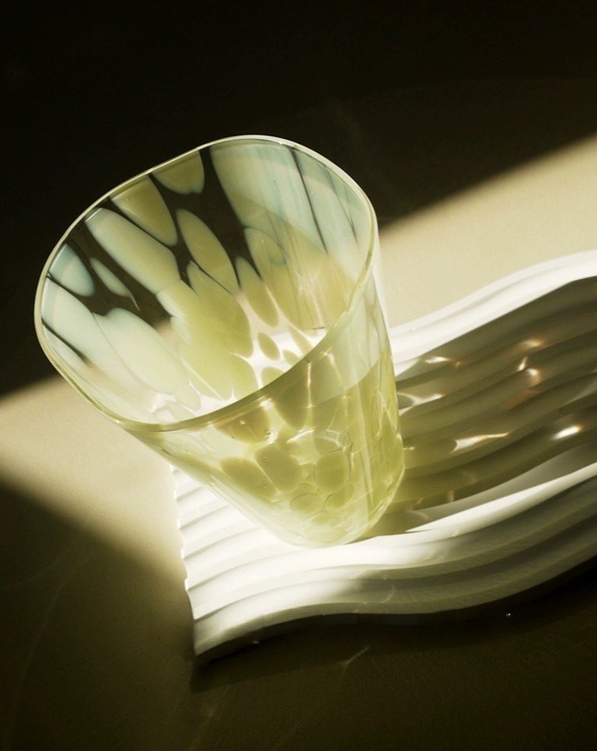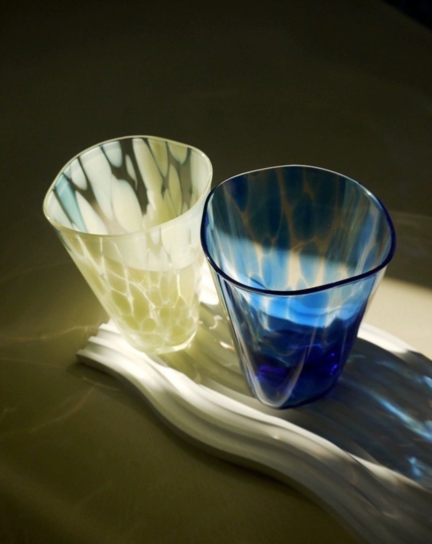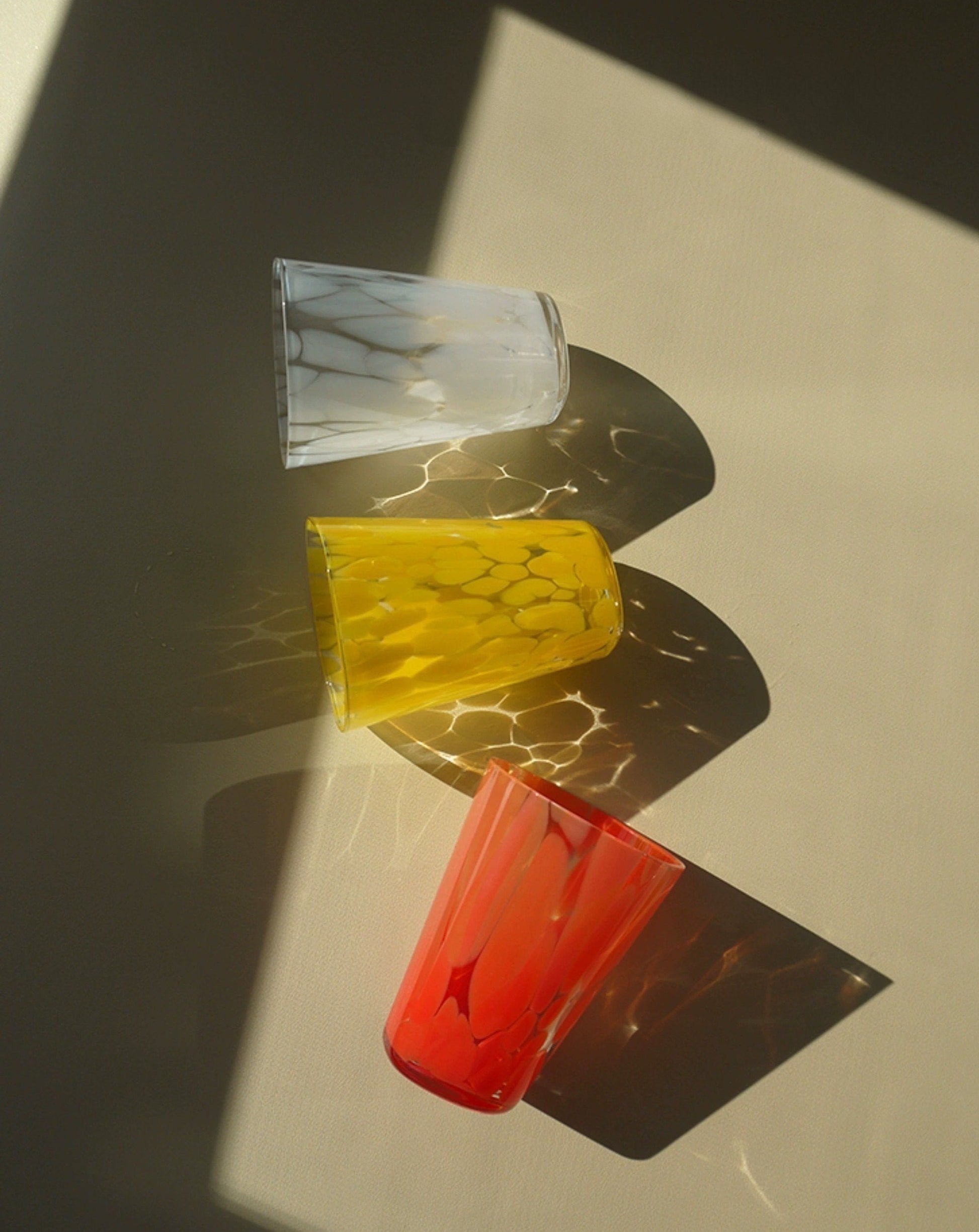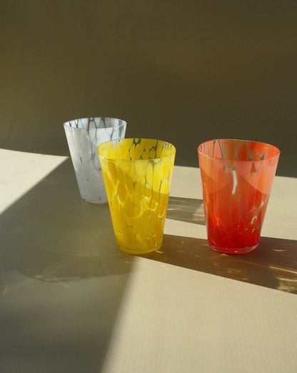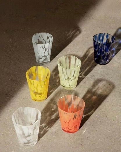 Mouth blown by skilled artisans, this coloured glass tumbler has an asymmetrical, organic shape that sits comfortably in your hand, and the irregular pattern of monochrome spots is unique to each individual glass and will add a playful & refreshing touch to your table