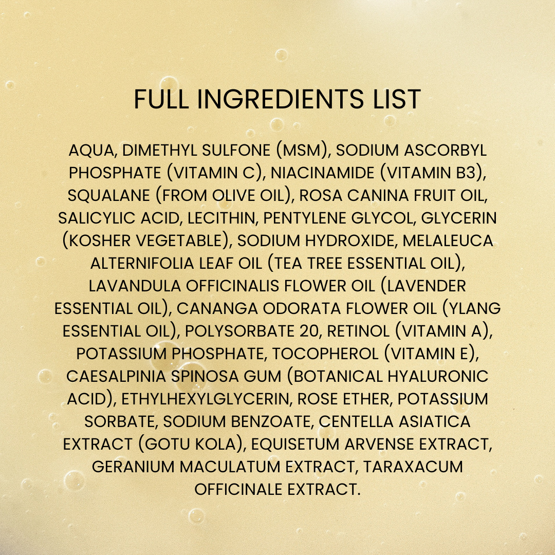 A wisely crafted serum infused with skin-barrier supporting, clarifying, and soothing ingredients blended in a fast-absorbing, lightweight texture suitable for even the most sensitive skin types. Thanks to the combination of 4% Niacinamide, Squalane, Salicylic Acid and Hyaluronic Acid, this serum boosts hydration, minimizes moisture loss, prevents oxidative stress while working on clogged pores, blemishes, and hyperpigmentation. This antioxidant-rich elixir targets dullness, excess sebum production, photodamage to yield a noticeably clearer, more even and resilient skin. Ideal for all skin types.