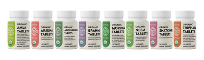 Our Organic Triphala Tablets contain low-temperature processed Amla, Haritaki, and Bibhitaki, compressed into easy-to-digest pills. (The temperature is kept below 104°F at all times. This ensures that delicate nutrients are preserved during the entire process.)