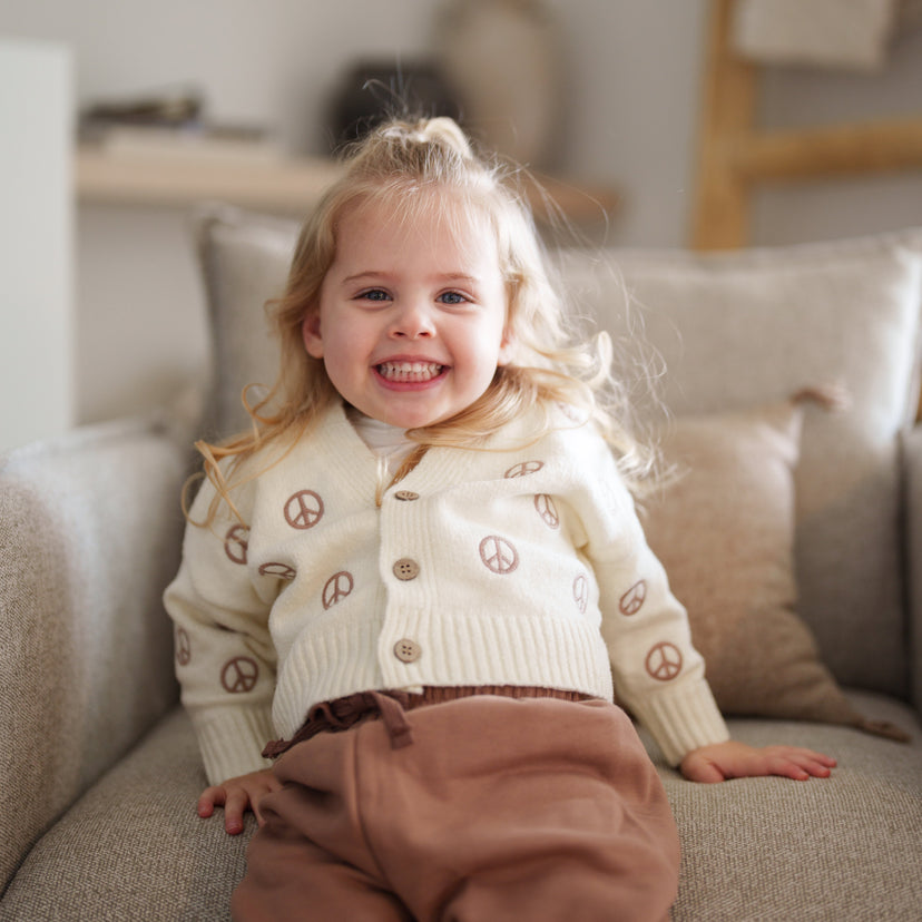 This charming baby cardigan is the epitome of comfort meets style. Perfect for a peaceful day in or a stroll around the park, this soft, ivory-hued knitwear features delicate peace symbols throughout, symbolizing our wish for a serene world for our little ones.