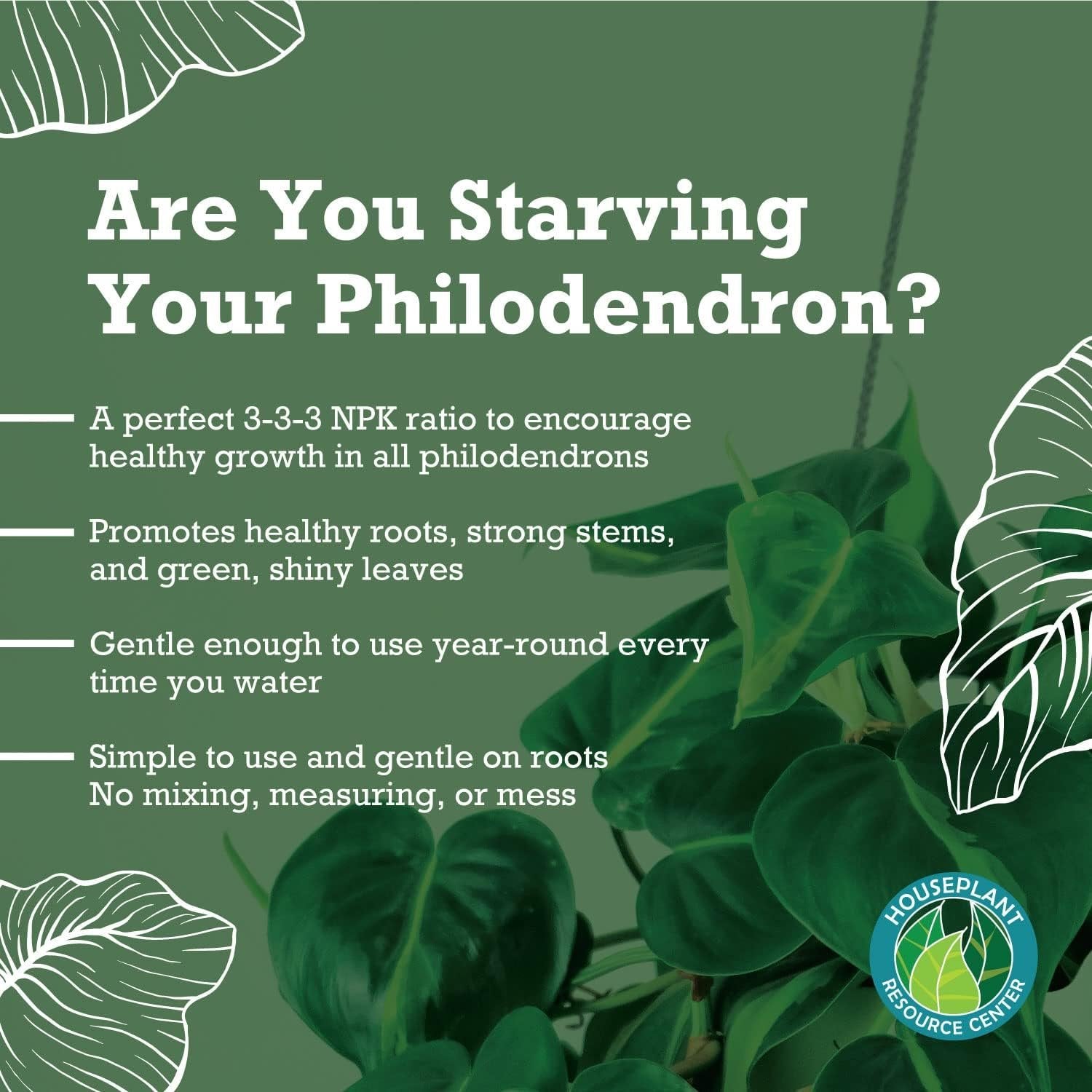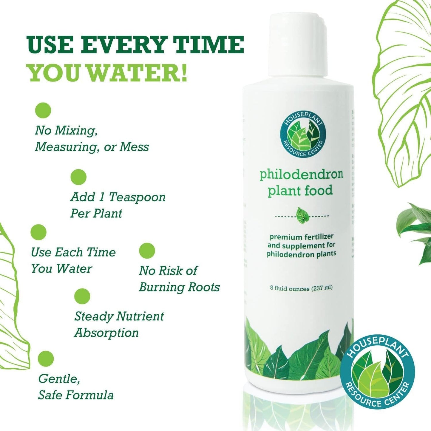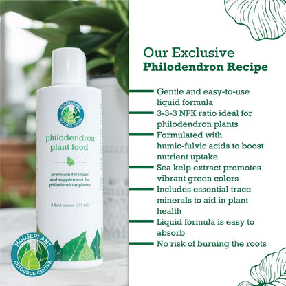 Philodendron care starts with a steady supply of nutrients to grow their healthiest forms. We created Philodendron Plant Food to be used every time you water without any risk of burning your plant. This means that your plant gets the steady supply of nutrients it needs, without being shocked by harsh concentrates or solid fertilizers. Simply mix into your watering can and water your philodendron normally. Made specifically for philodendrons our plant food will help guide your plants to a longer, more beautiful life and provide the most care possible. We have developed an extremely safe formula that you can use every time you water your plants. It has special micronutrients in it to keep your pothos safe and to deliver healthy growth in your plant. Give your philodendron plants the care they deserve!