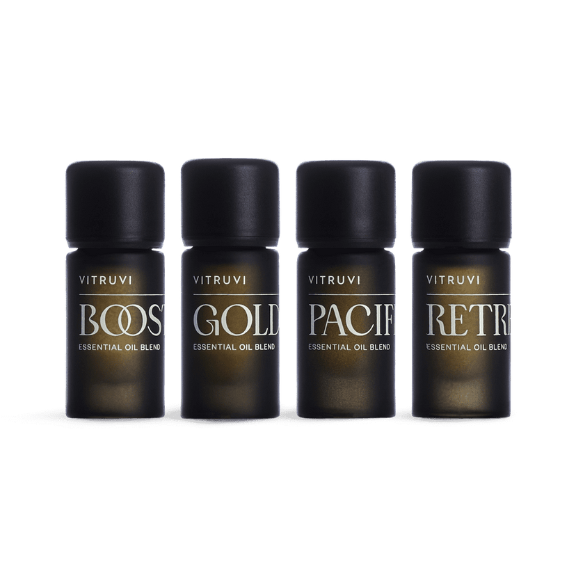 A collection of 4 uplifting essential oil blends: citrusy Boost, happy Golden, herbal Pacific, and tropical Retreat. Perfect for making your home feel light and invigorated.