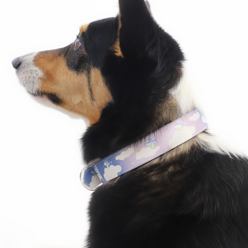 An ethereal mushroom collar with an ombre periwinkle hue. Made with rust-resistant metal hardware and ultra durable, rip-resistant material and stitching for strong and long wear.