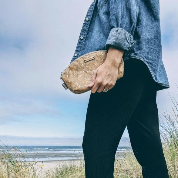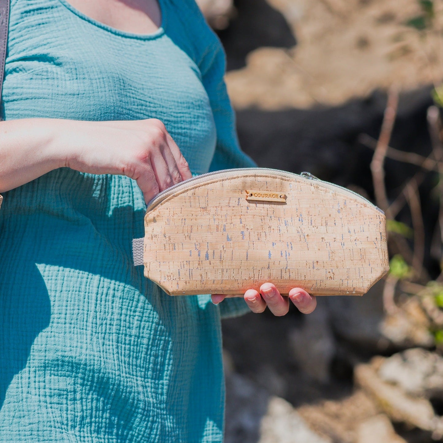 You'll love filling this curvy top bag with all your favorite goodies and notions. It's the perfect size for organizing makeup brushes, writing and art supplies, or any little bits that need containing. Cork fabric makes this bag a memorable RULE BREAKER, just like you!