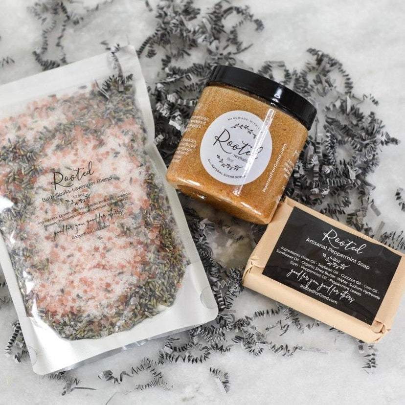 Treat someone you love to a relaxing self care gift set! This set includes three of our best selling products: Bath Soaks, Revitalize Sugar Scrub & Artisanal Soap!