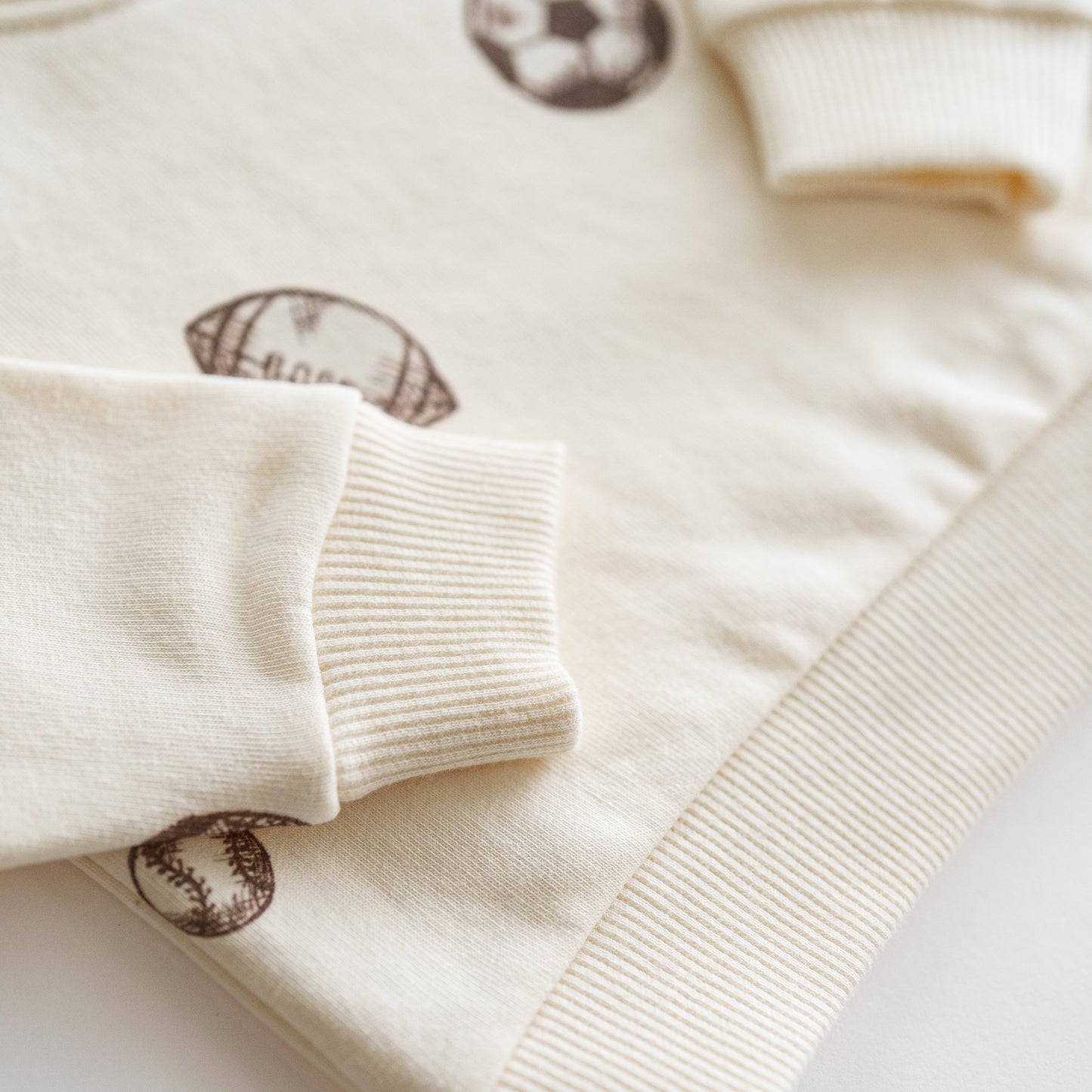 This crewneck comes to life with a hand-drawn sports design, featuring an array of balls from beloved games. It's not just a garment; it's a canvas that reflects the playful spirit of those budding athletes. Whether it's for crawling around the house or playing ball on the grass, this top is designed for comfort and movement.