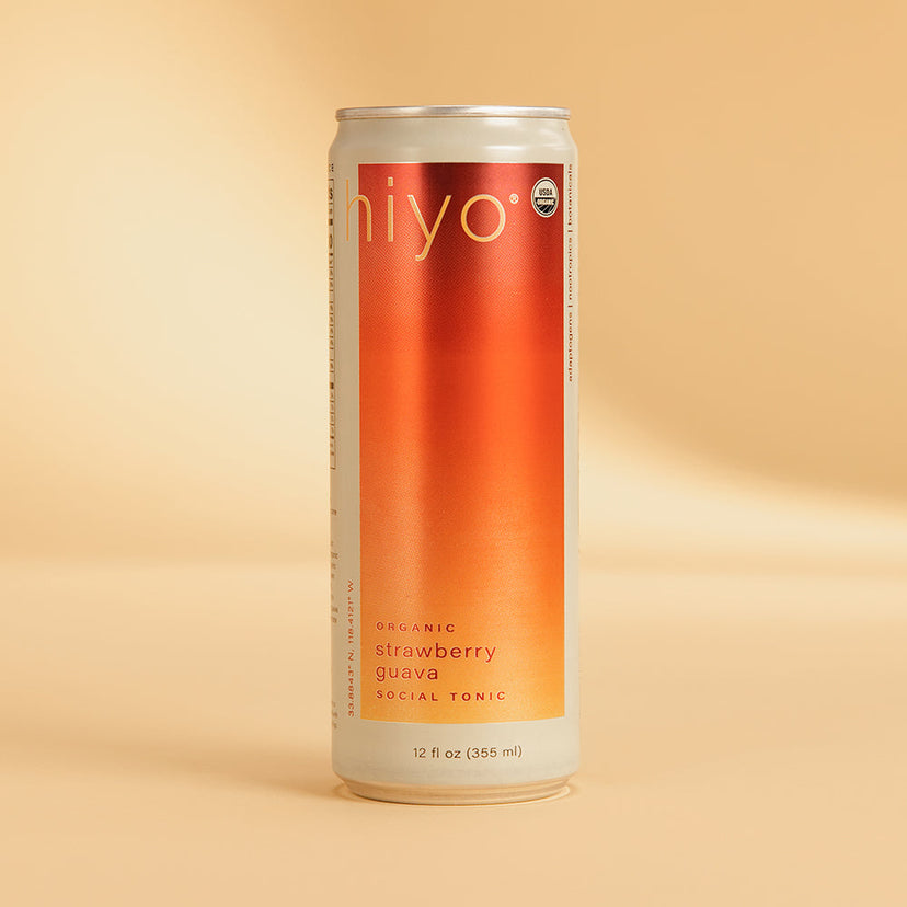 our non-alcoholic strawberry guava seltzer is vibrant, tangy, and just plain beautiful. the taste of ripe strawberries blends with the exotic essence of guava, gliding down the hatch like a sunset to the sea. crafted with organic adaptogens, natural nootropics, and functional botanicals, hiyo provides a stress-relieving, mood-boosting lift we like to call "the float."