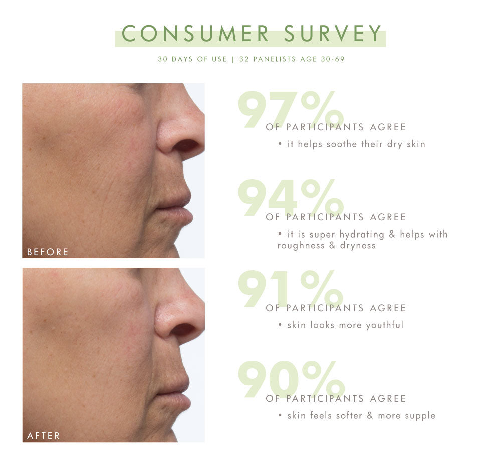 Consumer tests wow’ed: 97% agree it helps soothe their dry skin, while 94% agree it is super hydrating and helps with roughness and dryness. See the inset (left) for full study details!