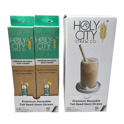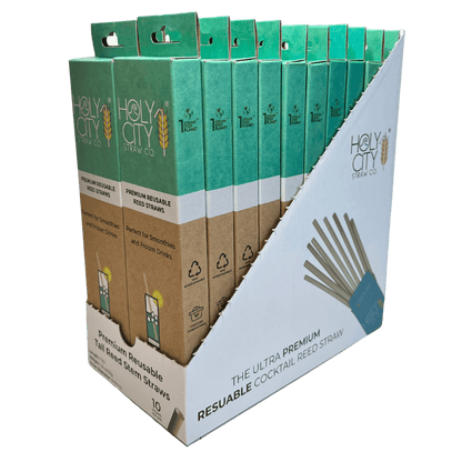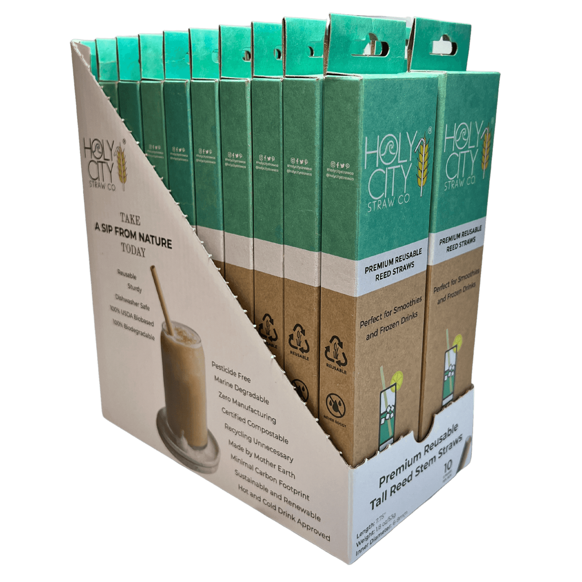 Each inner pack includes 20 boxes of our 10ct. reusable reed stem drinking straws, which can be sold individually or offered as bundles. The pack is ideal for traditional, specialty, or eco retailers, grocery stores or online resellers.