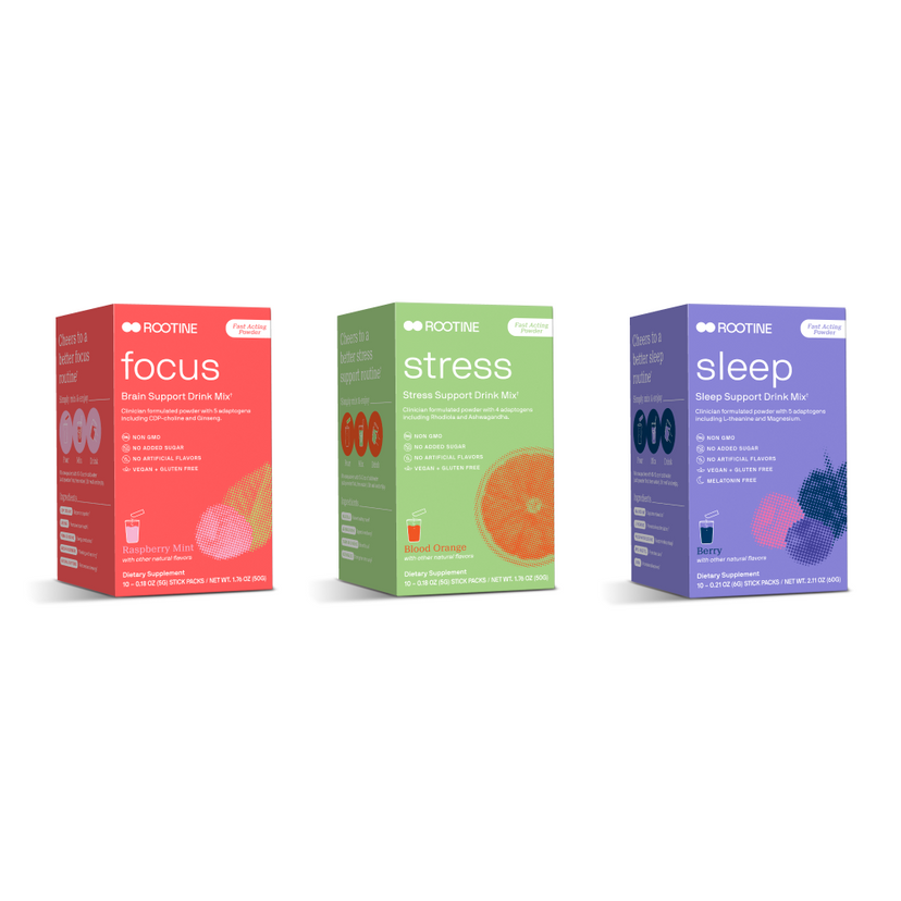 Get the essentials for vibrant health with our 3 most popular adaptogen drink mixes: Sleep, Stress, and Focus.