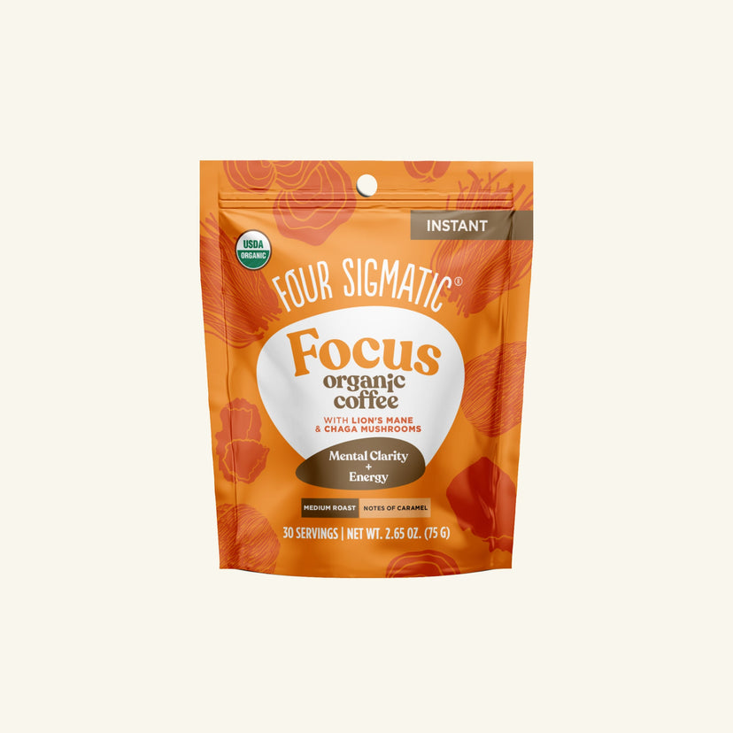 Organic instant coffee infused with lion’s mane and chaga mushrooms for focus in an online-exclusive 30-serving bag.