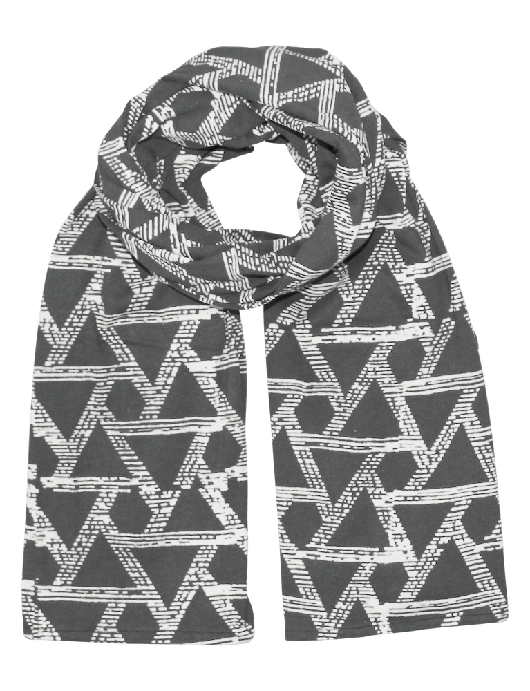 Brighten up that basic tee with this beautiful dark grey and white triangle scarf in organic jersey scarf. This super soft scarf will be sure to keep you warm and cozy.