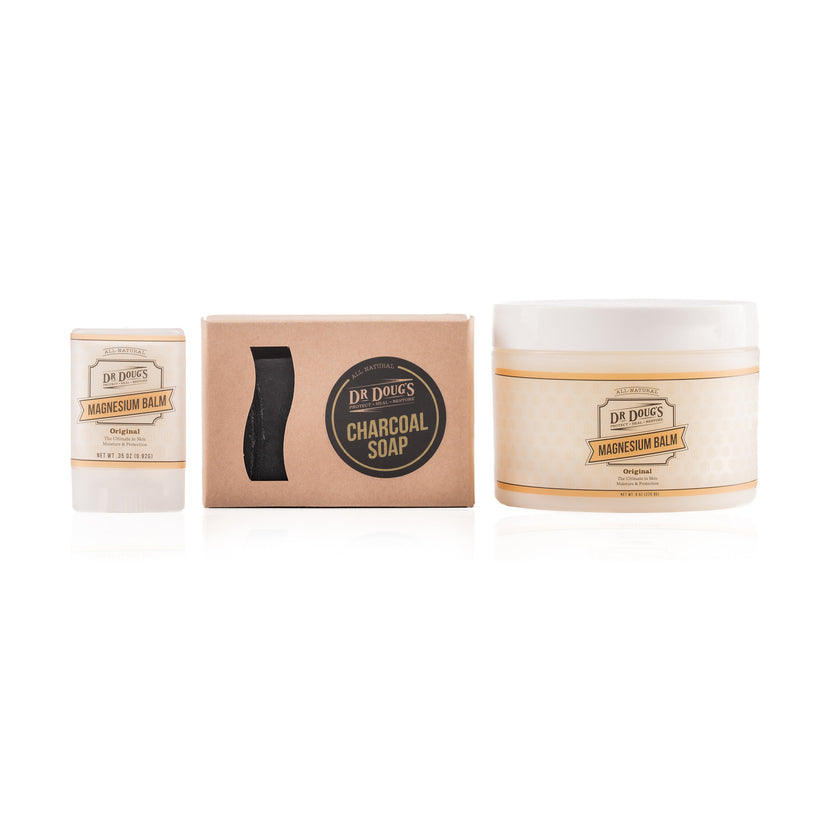 Discover tranquility with Dr. Doug's Ultimate Relaxation Bundle. Each item in this collection has been carefully chosen to offer a holistic approach to easing tension. Included are a large jar of our Magnesium Balm, a travel-size version, and a soothing Charcoal Soap, providing a complete relaxation experience