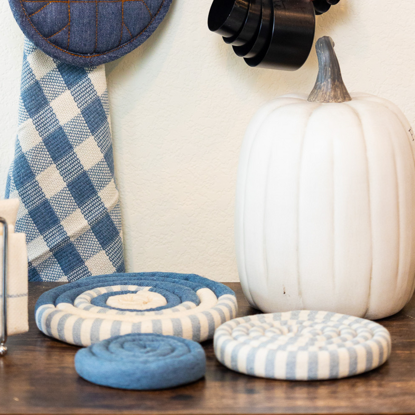 Transform your dining experience with our Upcycled Denim Trivets Set. The Medium Spiral Trivet adds elegance to your space with its intricate spiral patterns, while the Small Denim Trivet gives a touch of rustic charm. Both filled with a delightful cinnamon-clove aroma, they offer practicality and sweetness to your table or countertops. Welcome eco-conscious living with style.