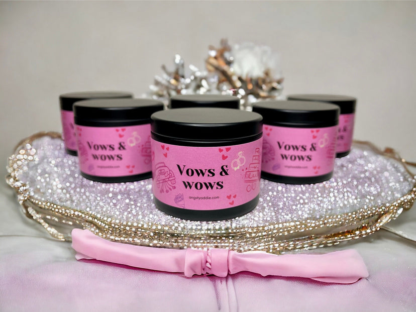 Designed to enchant brides-to-be, our Vows + Wows candle 4 oz. tins make a perfect rehearsal dinner favor, wedding favor, bridal shower favor and more! A nod to the milestone of engagement, a symbol of love, anticipation, and the promise of a lifetime together. Crafted of vegan coconut soy wax, enjoy a clean and eco-conscious burn that fills the air with an irresistible fragrance.