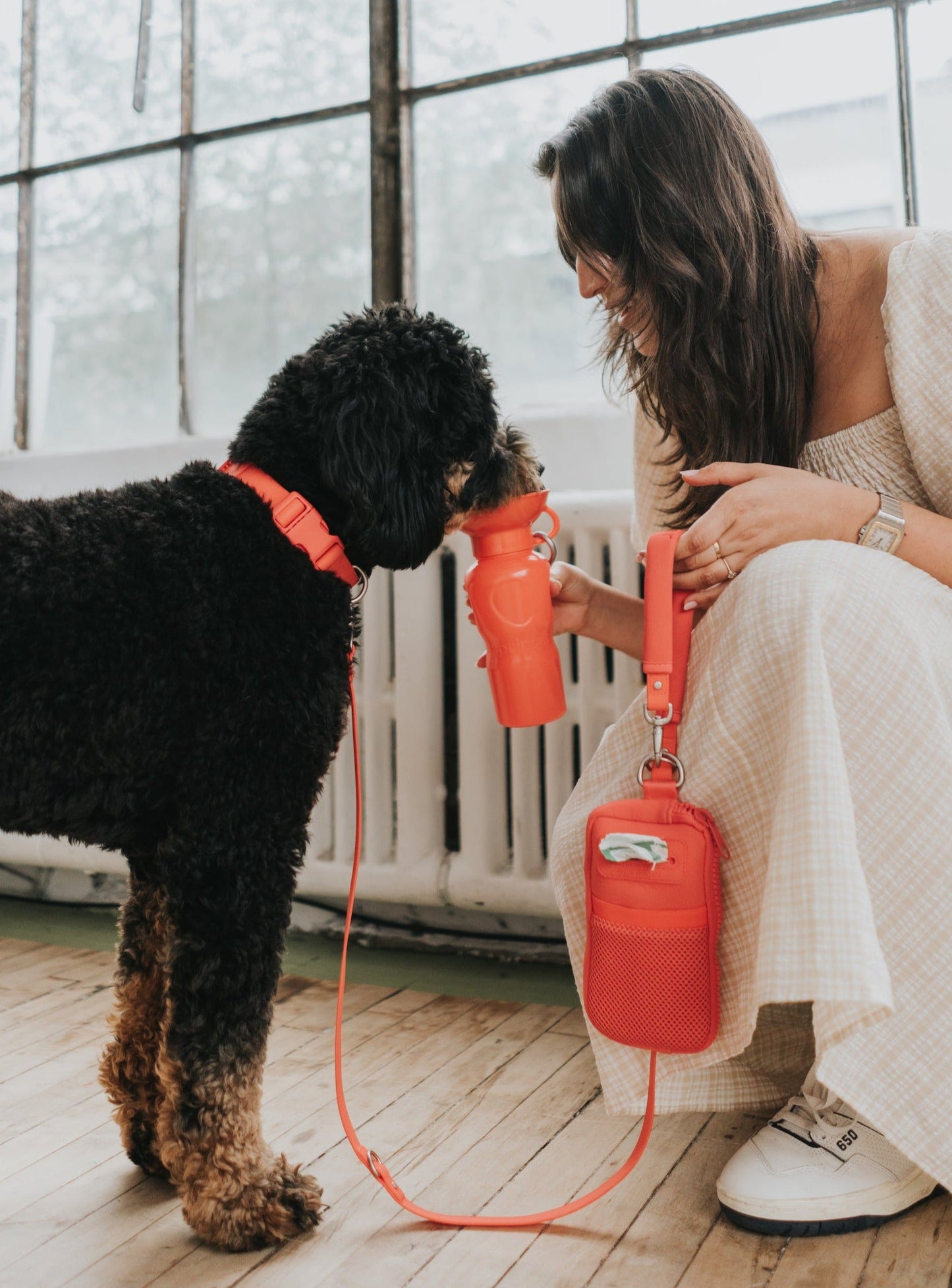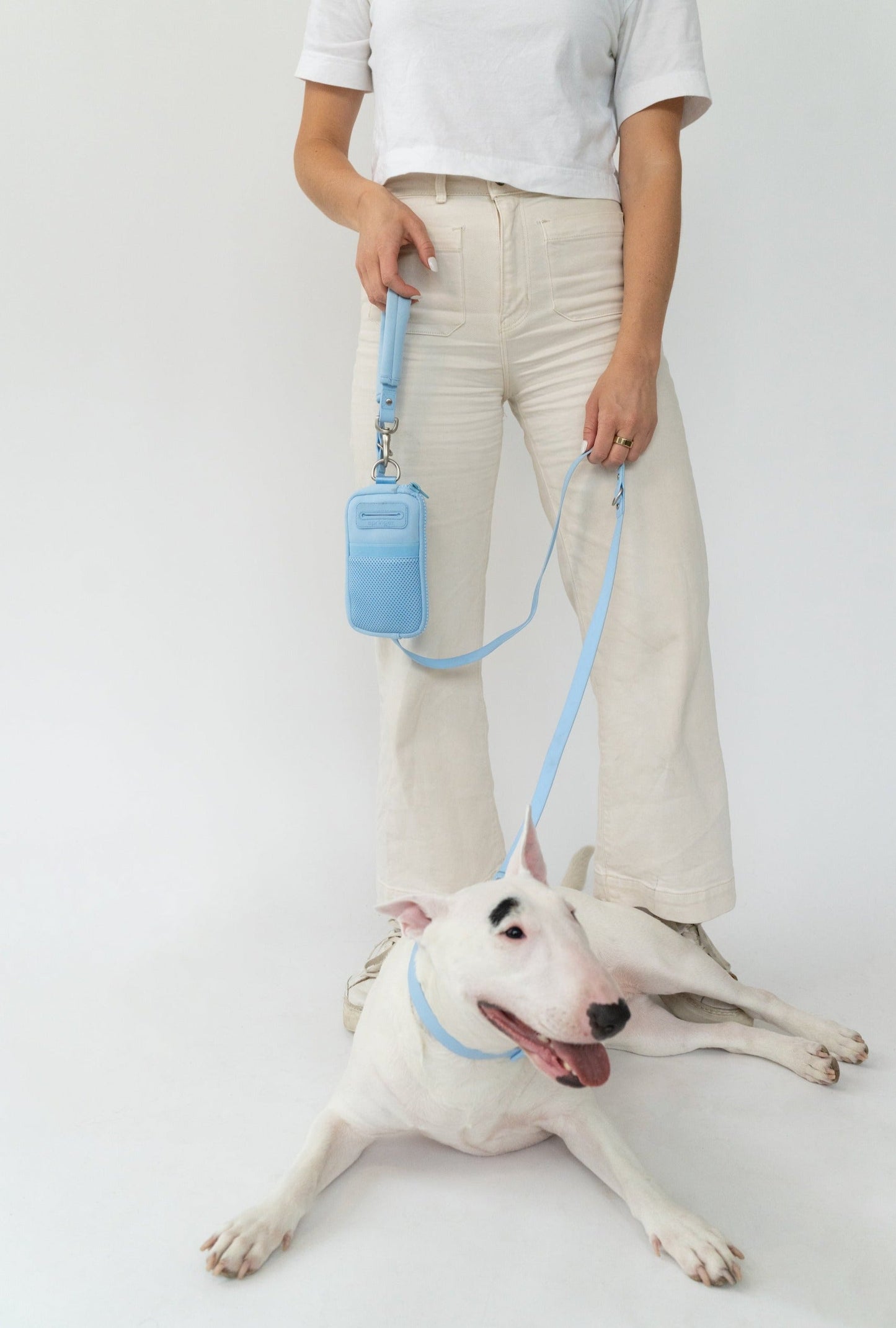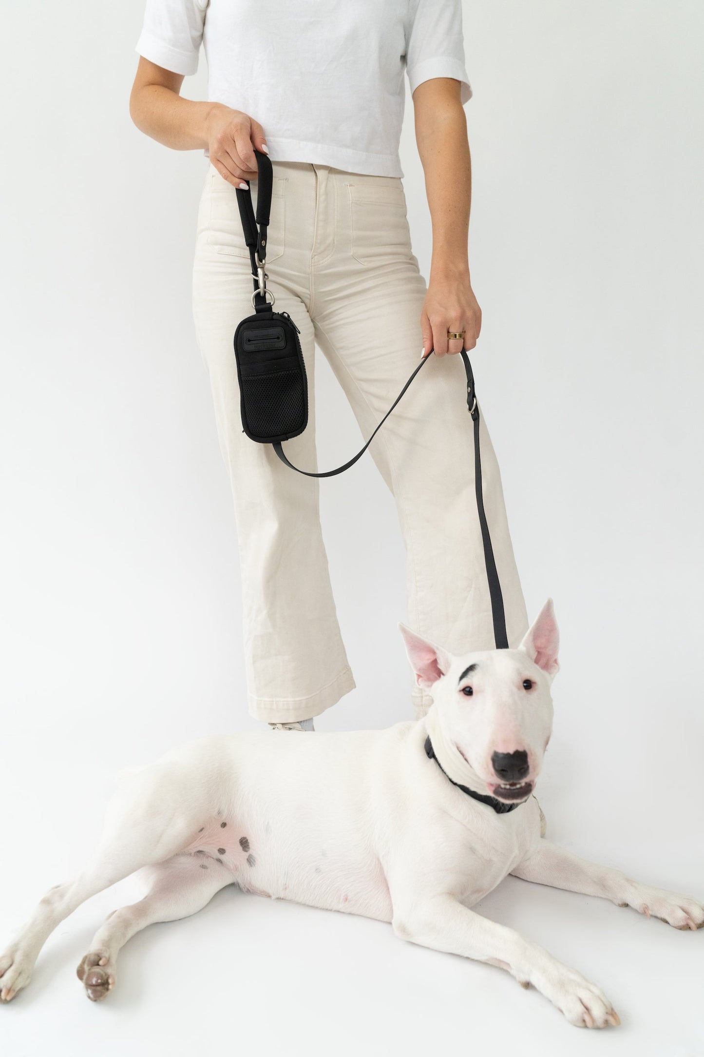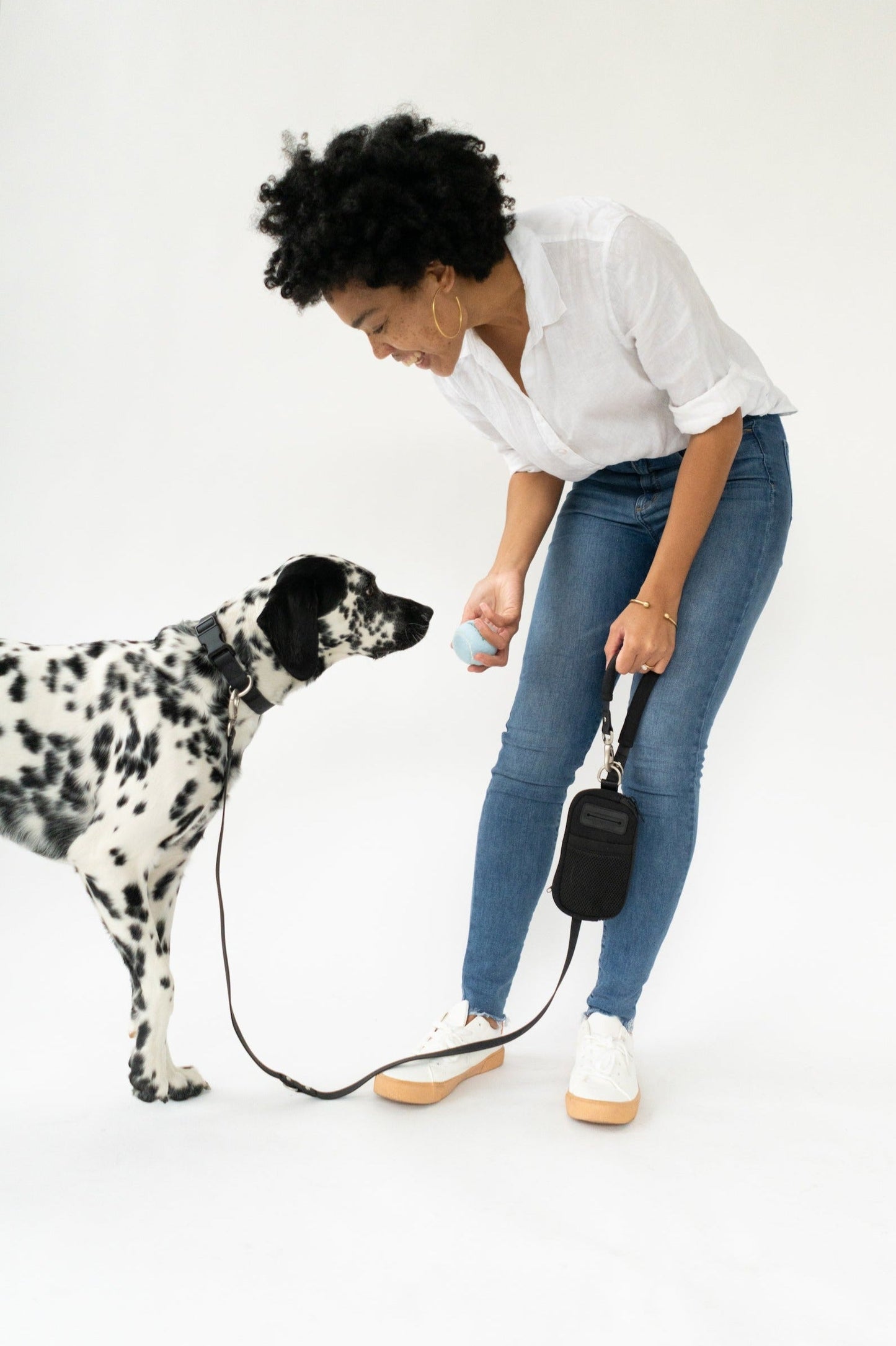 Introducing the all-in-one Walk Bag & Dog Leash— the ultimate solution for pup parents who want to keep all their essentials in one place while on the go. Made with a comfortable neoprene handle and innovative design, the bag provides a secure spot within easy reach for all your valuables, plus a leash to keep your pup by your side. You can store your phone, cards, and keys, along with all of your pup's essentials, such as a built-in poop bag dispenser and a mesh treat pocket for easy training! We even added a secret fold-out bag to store your pup's dirty tennis ball, making it easy to keep things clean and mess-free on the way back from the park.