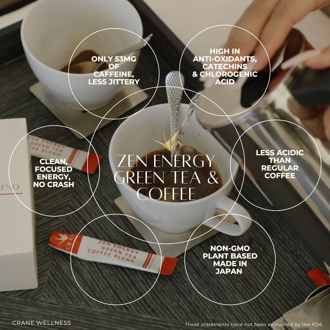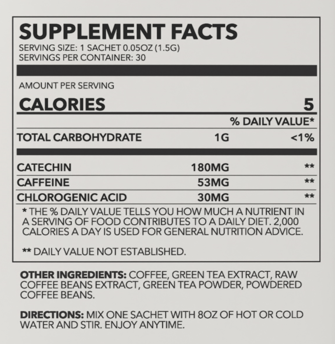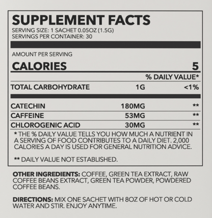 Our Green Tea and Coffee blend is the perfect clean energy produced from our proprietary blend of Japanese green tea extract and cold brewed coffee and has a great taste that isn't as bitter as most coffees. The individual powder sachets, making it easy to enjoy hot or cold, and tastes great with or without any sweetener or creamer you may decide to add. Plus, our unique formula provides more health benefits with catechins, chlorogenic acid and caffeine. The non-GMO coffee from Indonesia contained in this product is instantly frozen and ground at a temperature of -320 Degrees Fahrenheit in order to retain its original rich scent and flavor.